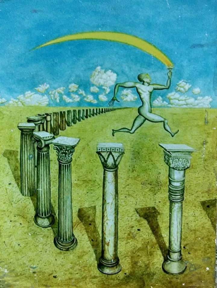The figure hopping atop the columns is Prometheus, the bringer of fire to mankind. The fire symbolizes technology and know-how. The columns — Moorish, Byzantine, Roman, Greek, Etruscan, Egyptian, etc. — represent the various civilizations that flourished in the course of human history.