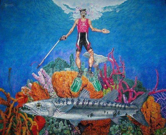 The persona I assumed in this painting is anti-heroic, so to speak. I said that I considered spear-fishermen as sportsmen par excellence. That was before. But no longer. I now see those who are into spear and deep-sea fishing for sports as no better than those who hunt for trophies in Africa. If they must kill fish, they should do it out of necessity—not for fun, not for thrills, and certainly not to earn bragging rights as champion sea hunters.