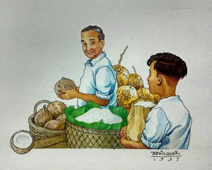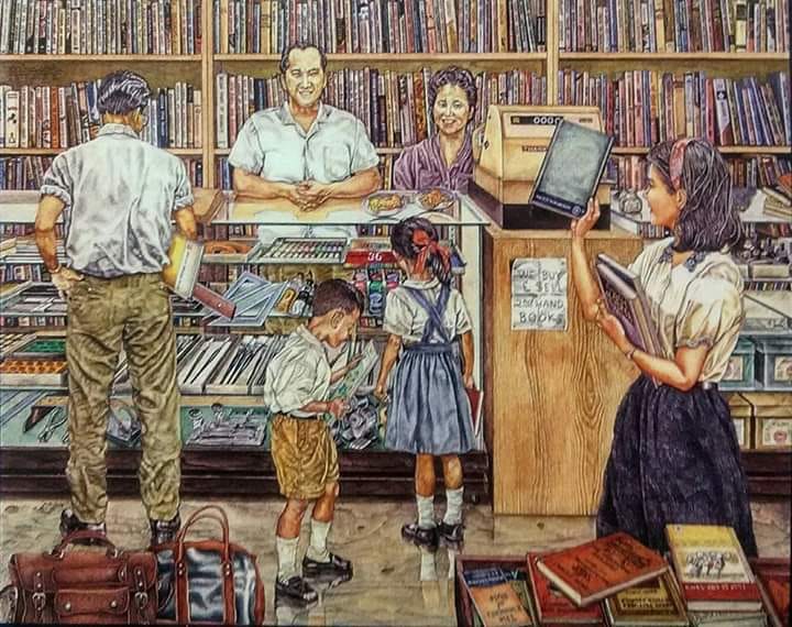 This illustration is just a reconstruction of sorts. I never saw how the old Rex Bookstore on Azcarraga (now Recto Avenue) looked like, nor was I given a photo of it as reference. What was provided me was just an old photo of the owners, Mr. and Mrs. Rey Fontelera, who are shown here manning the counter. I just used my imagination and lots of research to come up with that scene. But the glass showcase and cash register are authentic. Rex still has them in their main office in Quezon City where I made sketches of them. The books stacked on the table at the lower right hand corner are vintage school books which I have in my collection. The children are supposed to be students of my alma mater, Holy Child Catholic $chool in Tondo, as can be guessed by my schoolmates from their uniforms.
